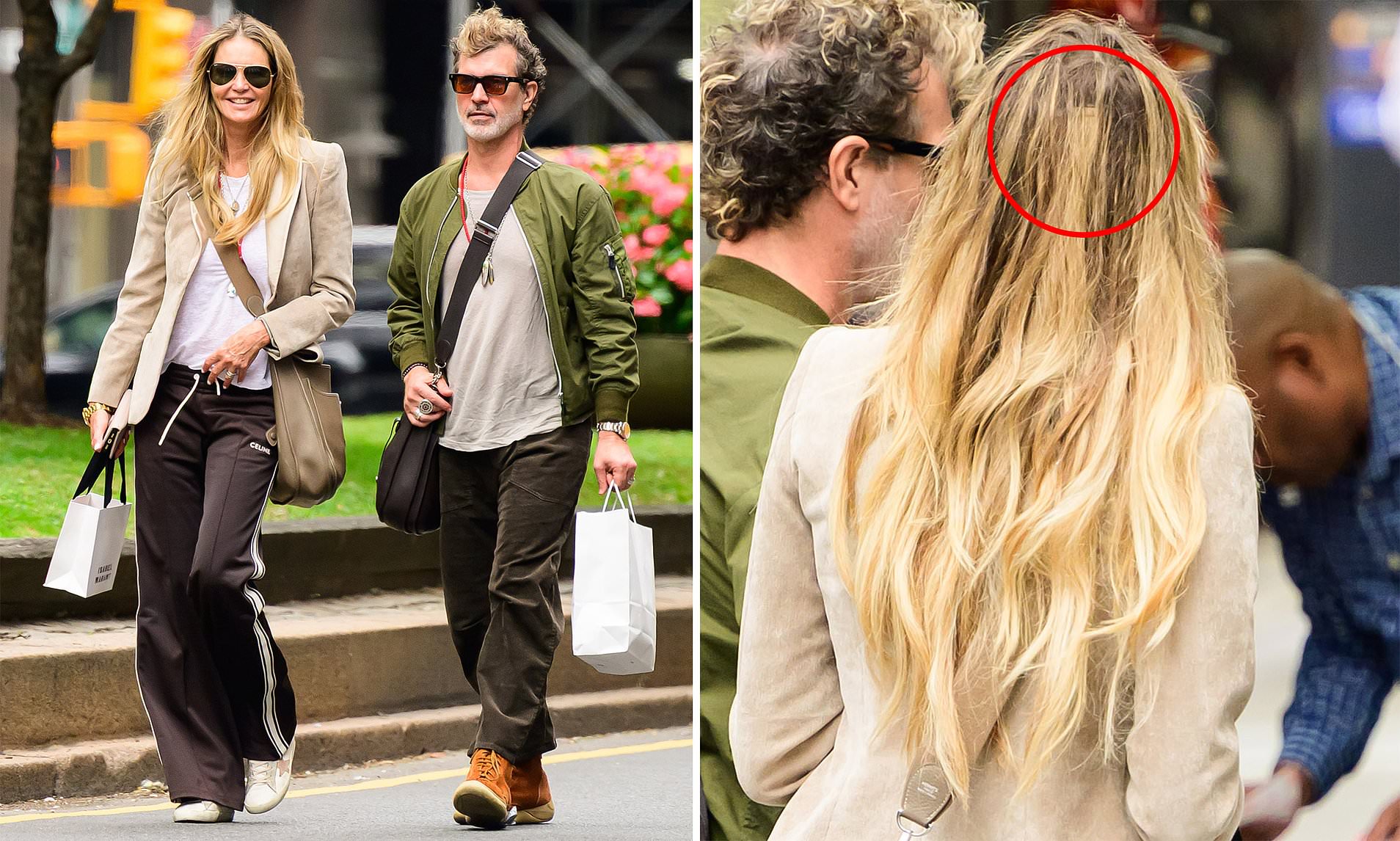 The 61-year-old model went on a shopping trip with Doyle in New York City and left one of her hair extension tapes exposed.